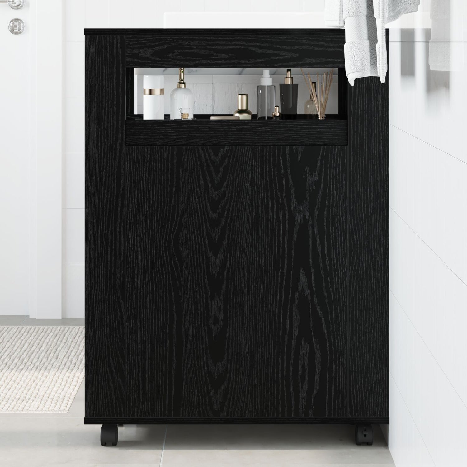 This narrow bathroom cabinet adds a dash of modern elegance while providing practical storage. Its compact size is spot-on for making the most of smaller spaces, making it perfect for offices, living rooms, or bathrooms, keeping your essentials neat and close at hand. Enhanced Mobility: The cabinet rolls on four wheels, making it easy to move around and great for switching things up in small spaces. Customisable Shelves: With three adjustable shelves, you can set things up just how you like, making it flexible for all your storage needs. Ample Storage: Designed with three built-in shelves for office supplies to bathroom essentials, maximising your vertical space. Sleek Finish: The matte black oak finish gives it an elegant look, blending in nicely with different decor styles and enhancing your home vibe. Durable Construction: Made from engineered wood, this cabinet stands up to wear and tear, ensuring it lasts while looking modern.