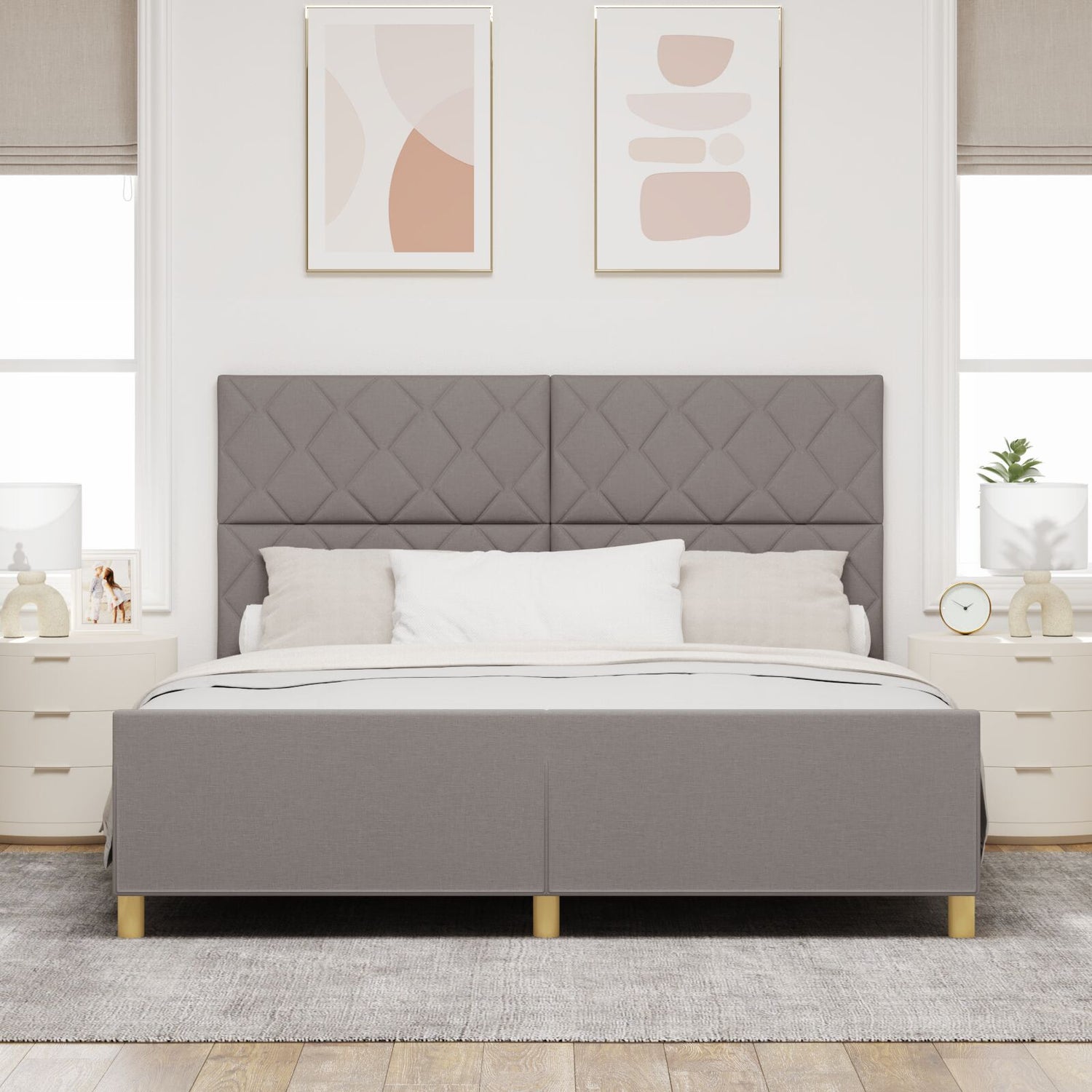 This Taupe Fabric Bed Frame mixes elegance and practicality, ready to spruce up your bedroom. With its trendy diamond block pattern and soft taupe colour, it adds a modern touch while being a comfy base for your mattress. Stylish Design: The diamond block pattern adds a nice touch, making your bedroom look fab. This design goes well with various decor styles, creating a lovely vibe. Durable Materials: Made from quality wood and fabric, this bed frame is built to last, ensuring you sleep soundly for years to come. Comfort Cushioning: The removable cushions make cleaning a breeze, keeping your bed looking sharp and ensuring you have a hygienic sleeping space. Spacious Size: With dimensions perfect for a 180 x 200 cm mattress, this frame offers plenty of room for relaxation, comfortably fitting two people. Easy Assembly: Built for straightforward setup, it comes with all the tools and clear instructions you need for easy installation.