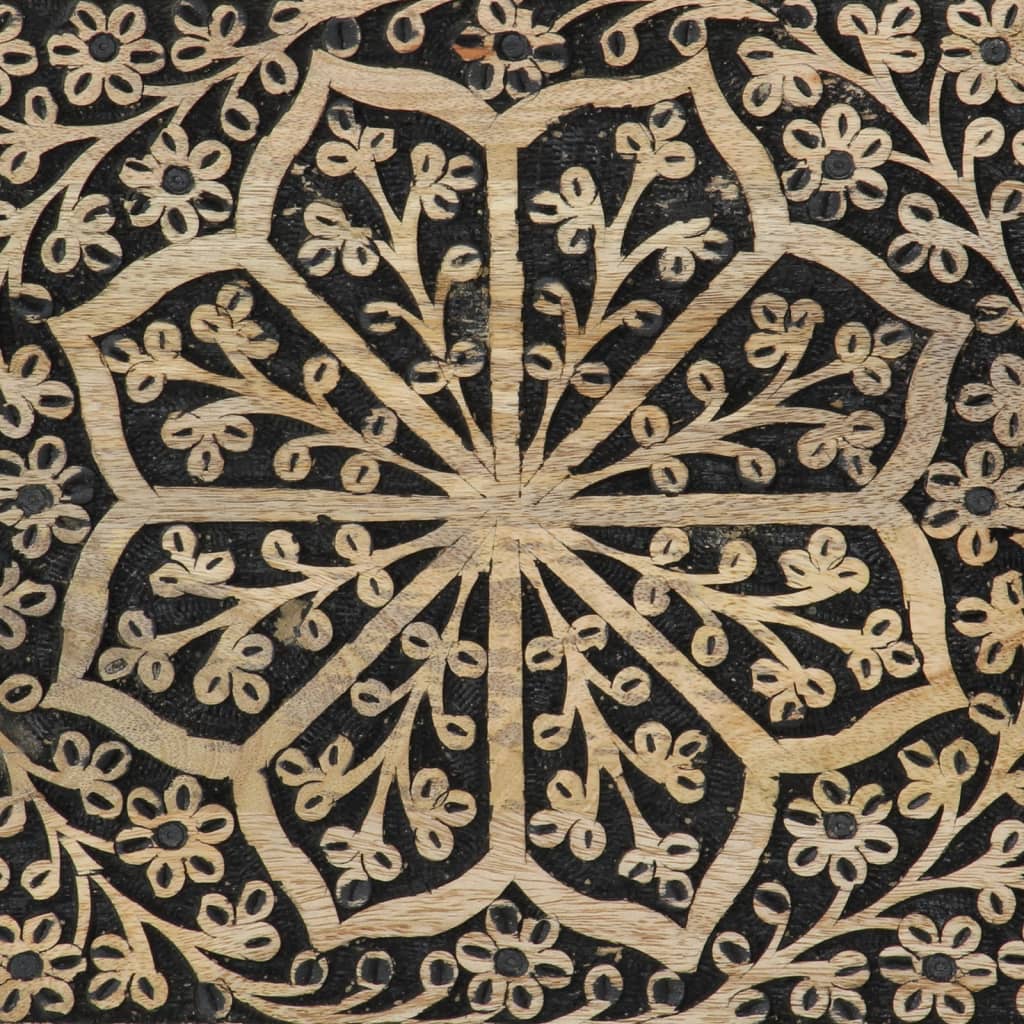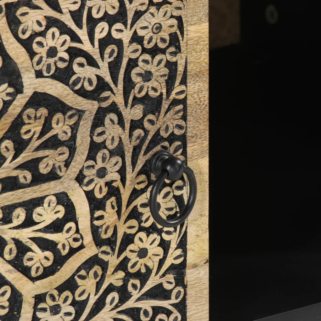 Add a touch of elegance to your living room with this stylish coffee table. Solid mango wood: Solid mango wood is a strong, tropical hardwood that makes sturdy furniture. Its beautiful wood grains make every piece of furniture slightly different from the next. Made of solid mango wood, the side table is durable and stable.Ample storage space: This sofa table offers ample storage space to keep your essentials well organised and within reach.Sturdy tabletop: The sturdy tabletop of the living room table is perfect for placing your drinks, food and other decorative items.Practical door: Keep your essentials free from dust by hiding them behind the door of this couch table.Iron legs: The iron legs add a calm style to your interior while ensuring stability.Retro style: This centre table with hand-carved floral patterns brings the luxury of retro style to your interior, being the focal point of your room. Good to know:Each item is unique with variations in colours and grains. The delivery is random, ensuring the exclusivity and individuality of your product.