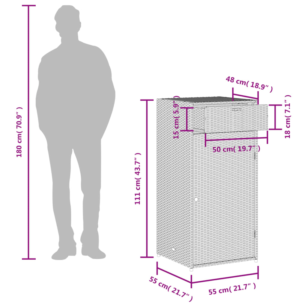 This garden storage cabinet is perfect for keeping your outdoor furniture cushions, gardening supplies, pool towels, and other items organised and easily accessible. Durable material: PE rattan, also known as poly rattan, is a strong, low-maintenance synthetic material that looks like natural rattan. It's lightweight, easy to clean, and commonly used for outdoor furniture due to its durability and weather-resistant properties.Ample storage space: This outdoor storage cabinet has a large space to store your garden tools, pool toys, outdoor cushions, and more.Robust and stable frame: The powder-coated steel frame ensures the garden furniture is strong and stable for daily outdoor use. Practical door: The door is equipped with a stainless steel door knob and a magnet for easy opening and closing. WarningTo prevent it being overturned, this product must be used with the provided wall attachment device. Good to know:To make sure your outdoor furniture stays beautiful, we recommend protecting it with a waterproof cover.