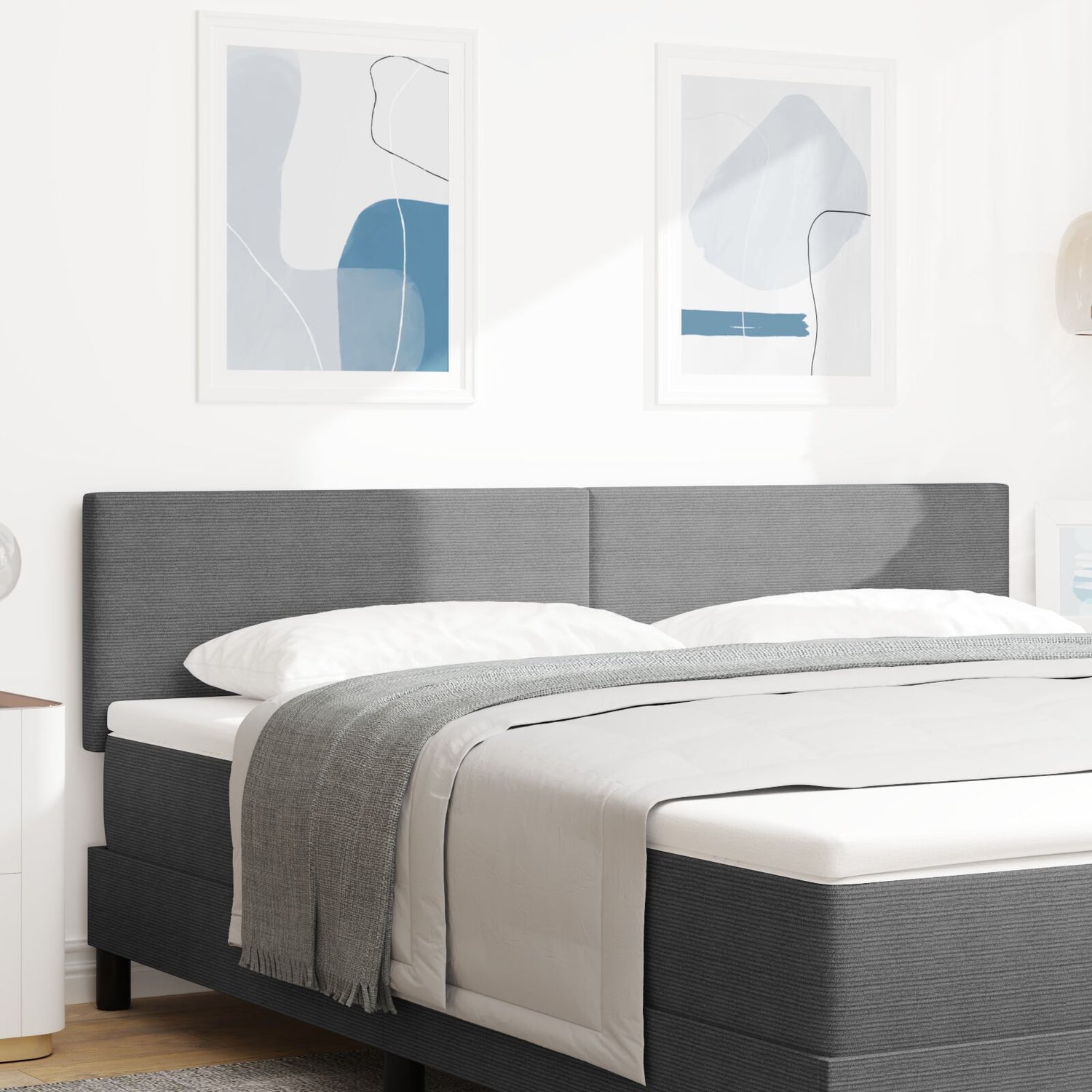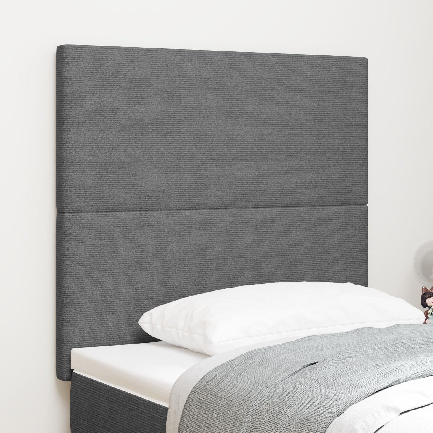 This stylish light grey upholstered headboard is the perfect fit for any modern bedroom, blending function and style. Its impressive height of 100 cm and width of 80 cm make it a standout piece that boosts your bedroom's decor and offers ultimate comfort for reading or just chilling in bed. The solid construction combines solid pine wood and engineered wood with a lovely corduroy fabric, ensuring it's a lasting addition to your home. This headboard has a sleek and modern design with a matte finish that gives it a non-reflective, eye-catching look, enhancing your bedroom's overall vibe. Made for wall-mounting, this design efficiently uses vertical space, making it a great pick for smaller rooms or minimalist styles without skimping on looks. The soft and smooth texture not only adds to the aesthetics but also provides a plush feel, making every moment in bed comfy and enjoyable. You can get this headboard in various colours and sizes, allowing for a modern touch that fits your personal style and bedroom theme.