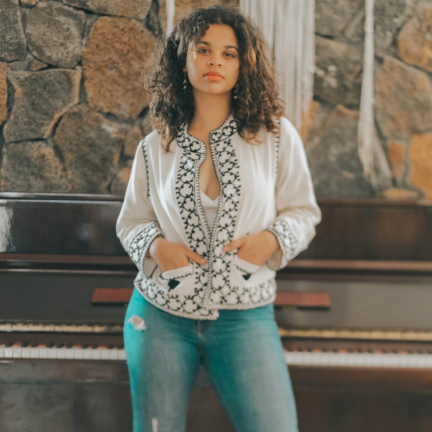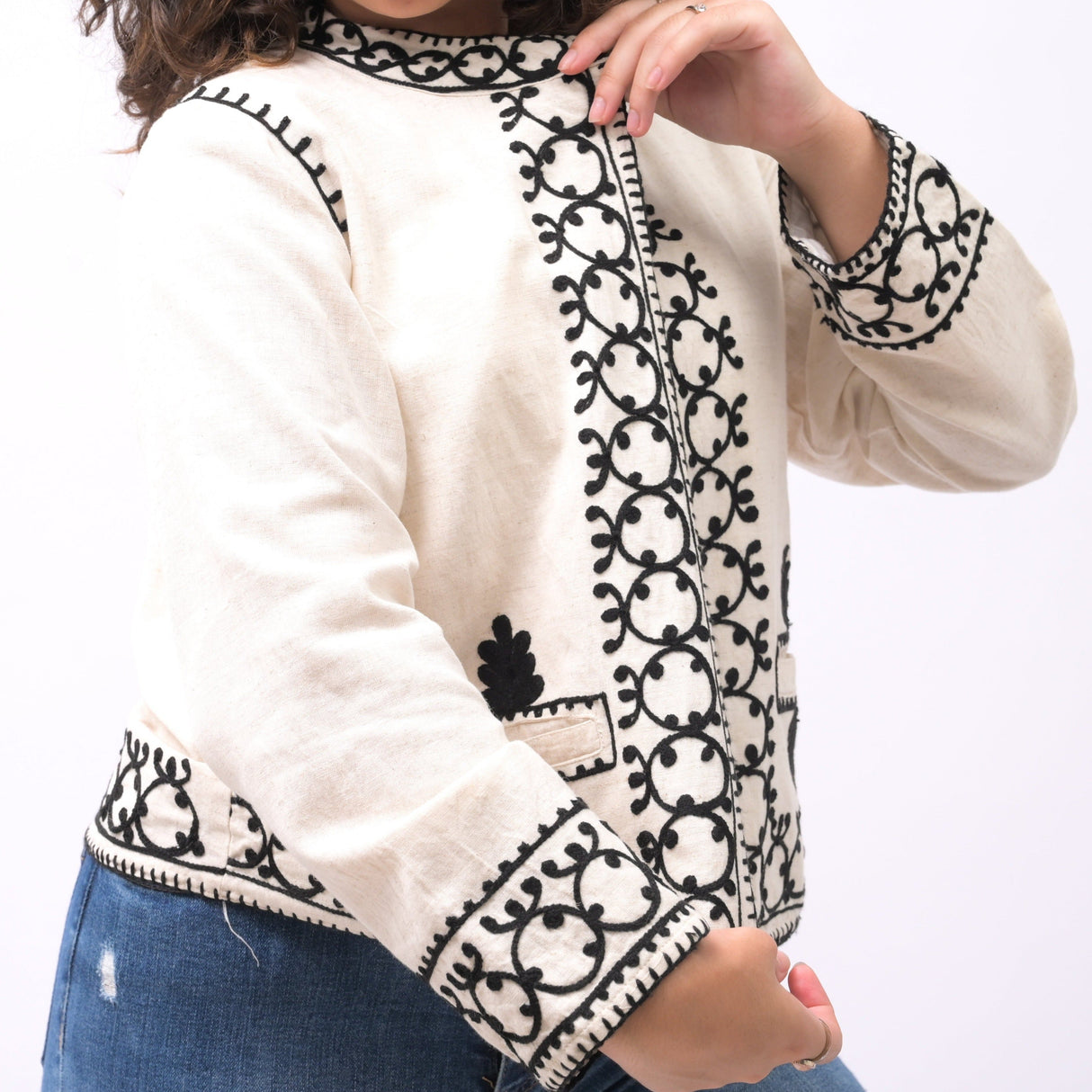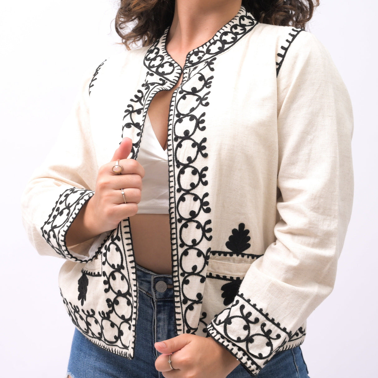 Whether you seek to elevate your casual attire or add a touch of sophistication to your formal ensembles, the Tranquil Oasis Artisan-Crafted Embroidered Blazer effortlessly adapts to your style. For a relaxed vibe, pair it with your favorite jeans and a simple t-shirt, allowing the blazer's embroidery to take center stage. For a more polished look, opt for tailored slacks and a crisp white blouse, letting the blazer elevate your professional style.