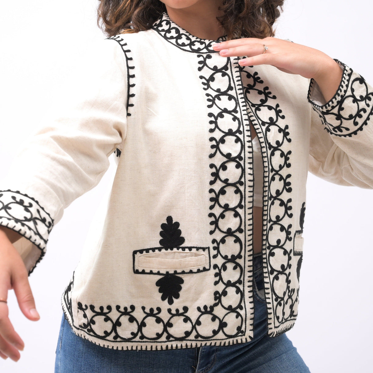 Step into a realm of exquisite artistry and effortless style with the Tranquil Oasis Artisan-Crafted Embroidered Blazer, a unique and captivating piece that seamlessly blends elegance with a touch of whimsy. Handcrafted with meticulous attention to detail, this blazer embodies the essence of timeless beauty and versatility.